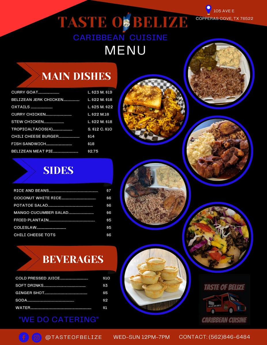 If you're craving something vibrant and full of flavor, Taste Of Belize Caribbean Cuisine Menu is the perfect place to dive into authentic Caribbean dishes right in Copperas Cove. Located at 105 W Ave E, this spot brings a burst of tropical flavors, offering everything from savory jerk chicken to mouthwatering stews and fresh seafood, all prepared with traditional spices that give you a true taste of Belize. Each dish is crafted with care, offering a mix of sweet, savory, and spicy notes that transport you straight to the Caribbean. Whether you're a fan of rich, tender meats or light and zesty seafood, the menu is sure to have something that will satisfy your cravings. It's not just a meal; it's an experience of flavors you won't forget!